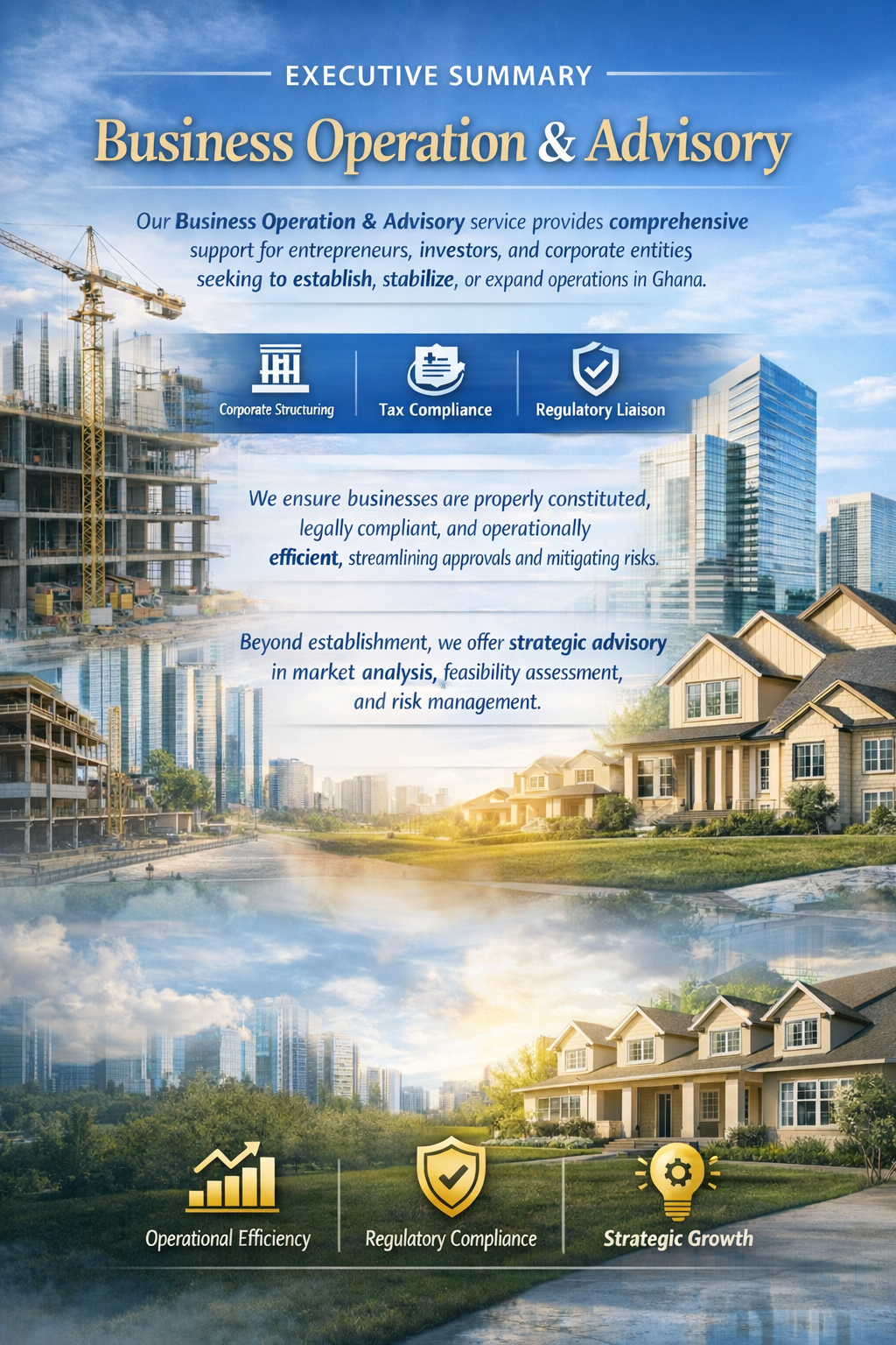 Our Business Operation & Advisory service provides comprehensive support for entrepreneurs, investors, and corporate entities seeking to establish, stabilize, or expand operations in Ghana. We deliver structured solutions that align operational frameworks with regulatory requirements, market realities, and long-term strategic objectives.